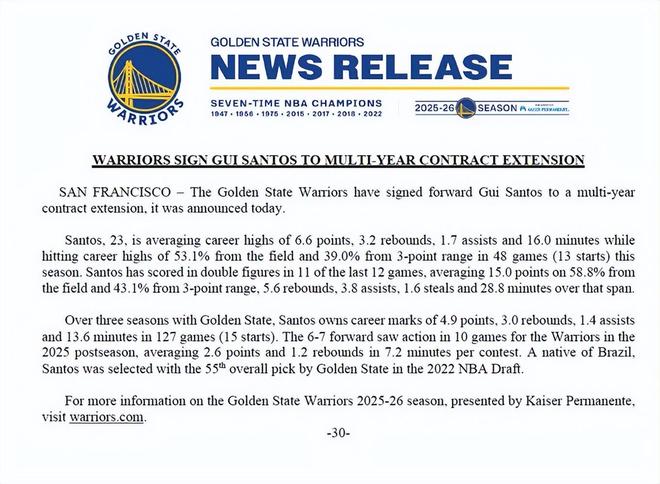 北京时间3月1日,勇士官方宣布,三年级前锋桑托斯已经与球队签下一份多年续约合同。据名记Shams报道,桑托斯签下的是一份3年1500万美元的续约合同,其中包含2028-29赛季球员选项。