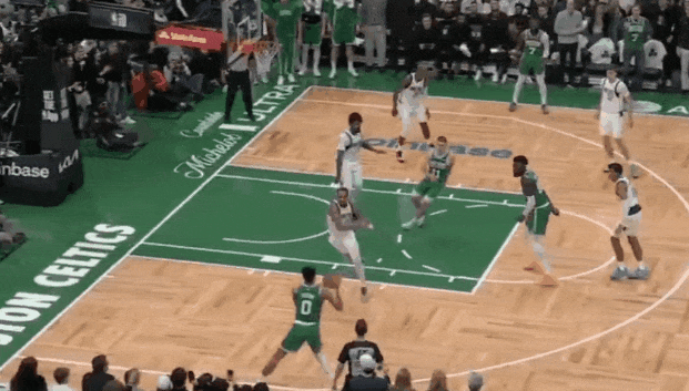 塔图姆尺寸视野出球协防,杰伦力量强攻中投领防。历来是塔图姆策动,杰伦攻坚。