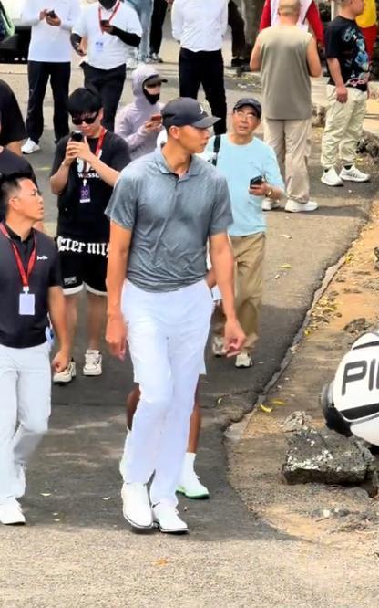 这是一场规格极高的职业业余配对赛,他一身专业的高尔夫行头,挥杆动作舒展漂亮,完全是以一个纯粹的体育爱好者的身份在享受竞技。