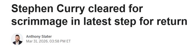 北京时间4月1日,据ESPN报道,勇士球星斯蒂芬-库里终于在医疗团队的许可下,于今日参加了5v5对抗训练,这是他因持续性右膝伤势复出前最新、也是最关键的一步。