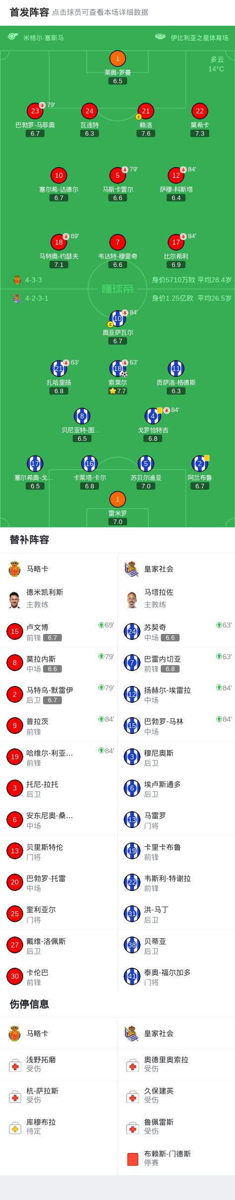 北京时间3月1日西班牙足球甲级联赛 联赛 第26轮,马略卡主场对阵皇家社会。皇家社会索莱尔破门。最终比分马略卡 0-1 皇家社会。
