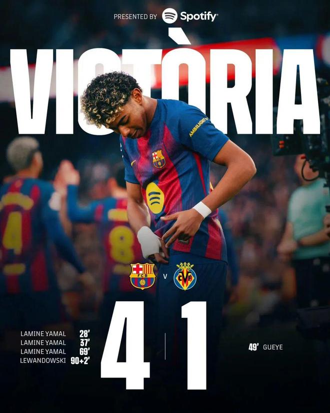亚马尔生涯首次戴帽!巴萨4比1大胜黄潜,先赛一场4分领跑