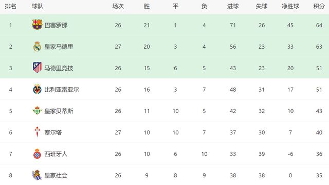 本场过后,皇马在西甲继续排名第2位,他们在多赛1场的情况下,落后榜首的巴萨1分。对于皇马来讲,本轮拿下塞尔塔,很可能改写他们的命运,因为接下来巴萨将做客对阵毕尔巴鄂竞技,对手实力不俗,绝对有机会拖住巴萨。哪怕巴萨能顺利拿下毕尔巴鄂竞技,第30轮他们还将做客对阵马竞,这场比赛随时会丢分。也就是说,只要皇马自己不掉链子,在第二回合的德比大战之前(第35轮),双方的差距随时有可能缩小到1场球以内,届时姆巴佩等人可能回归,他们哪怕客场作战,未必不能双杀巴萨。现在来看,西甲争冠又迎来了变数,如今伤兵满营的皇马,还没有放弃争冠,他们还有逆袭的希望!