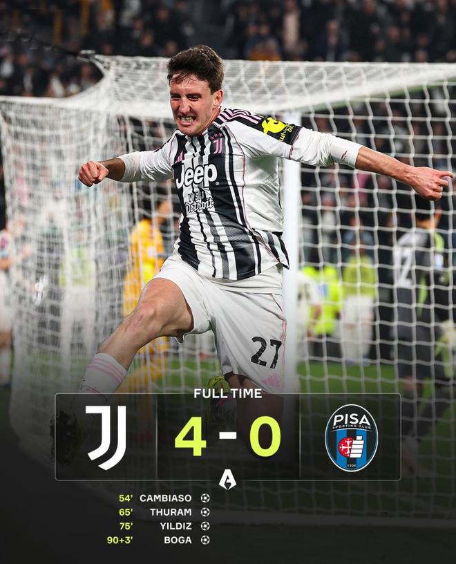 比赛进入补时阶段,洛卡特利送出助攻,博加打进锁定胜局的一球。最终尤文图斯4-0横扫对手,结束此前的不胜尴尬。这场胜利也让尤文重新回到争四行列。目前他们积50分,虽然暂时排名第六,但与前面的球队差距并不大。