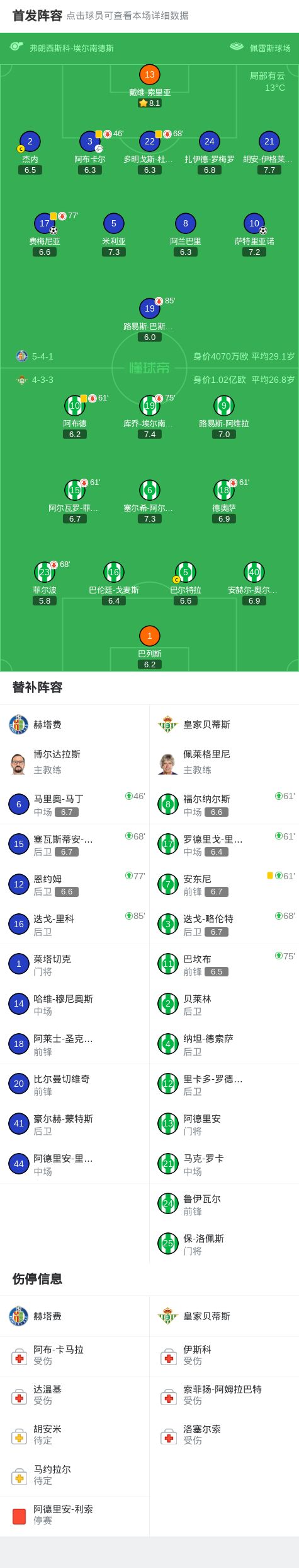 赫塔费vs皇家贝蒂斯:萨特里亚诺、戴维-索里亚首发,菲尔波、阿布德出战