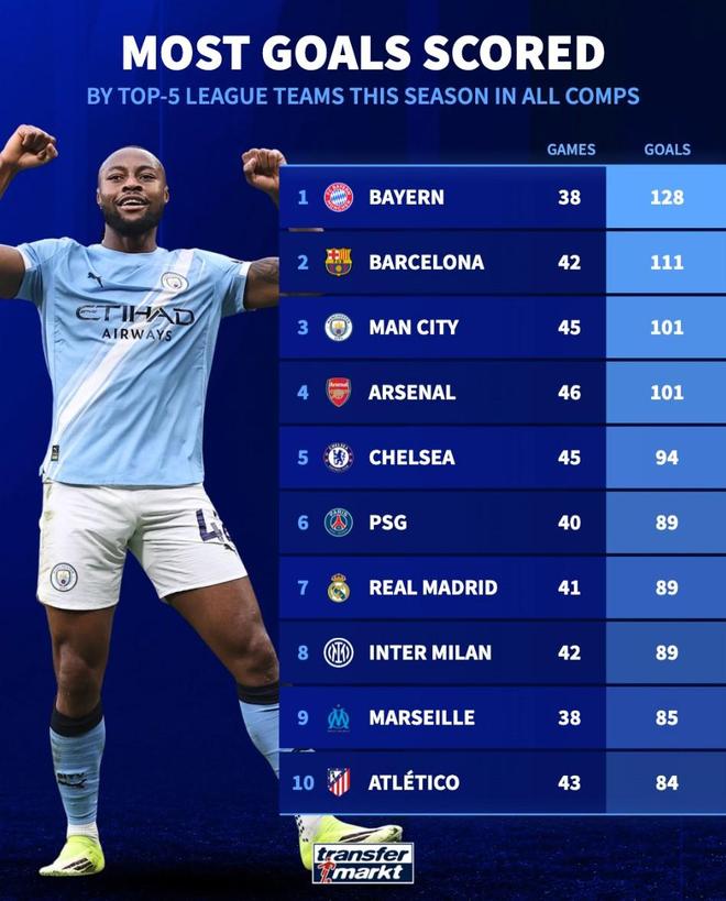 本赛季五大联赛球队进球榜:拜仁128球第1,巴萨第2,曼城第3