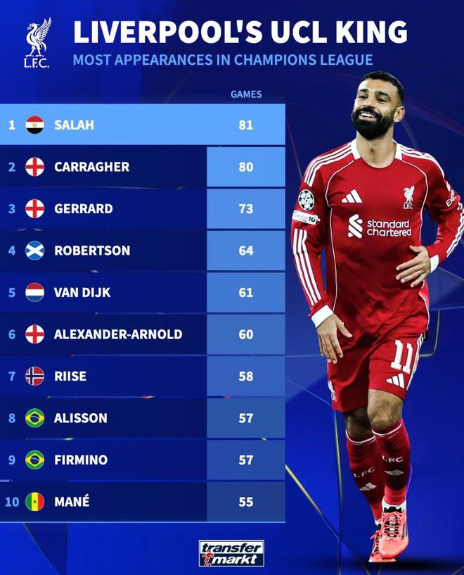 德转统计利物浦队史欧冠出场数前10:萨拉赫81场超卡拉格排第1