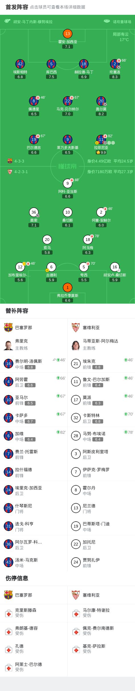 第45+3分钟,胡安卢-桑切斯传中,奥索端射破门扳回一球,塞维利亚1-3巴萨