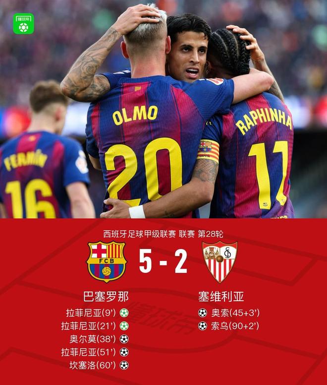 剑南春丨巴萨5-2塞维利亚,拉菲尼亚戴帽,坎塞洛破门+两造点