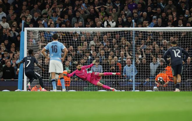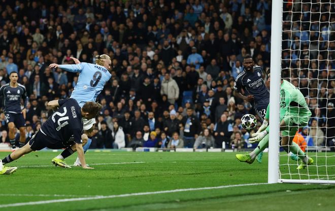哈兰德开场便两次考验他的扑救技术,瓜迪奥拉随即变阵三中卫,可惜防线磨合之际,维尼修斯又因追求角度错失扩大比分的机会。