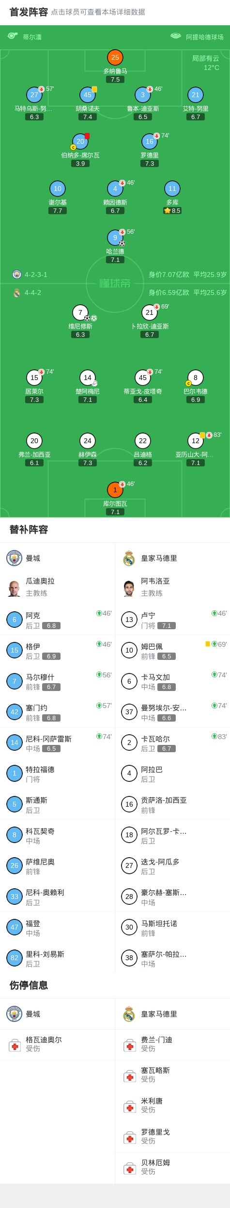 北京时间3月18日欧洲冠军联赛 1/8决赛次回合,曼城对阵皇家马德里。上半场,B席获红点套餐后维尼修斯主罚命中,多库助攻哈兰德抢射破门;下半场,楚阿梅尼助攻维尼修斯上演梅开二度。最终比分曼城 1-2 皇马。两回合总比分曼城1-5皇马。