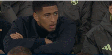 第15分钟,镜头给到了因伤缺阵的贝林厄姆和替补的姆巴佩