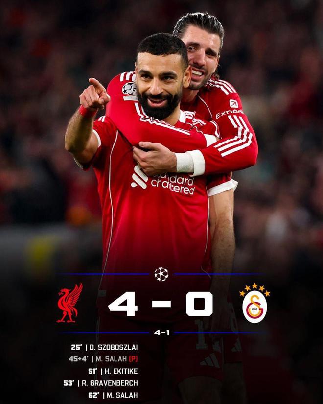 随后红军越战越勇,比赛一度进入“萨拉赫时间”,先是单刀被扑,随后点球勺射失败,埃及法老在上半场错失两次破门良机;其次,麦卡利斯特还有一次头球击中横梁弹出,半场结束,加拉塔萨雷完全被红军围着狂轰,能以0-1进入中场休息,命可真硬!