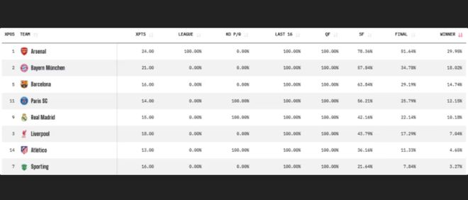 根据Opta的数据模型,目前最大的夺冠热门是阿森纳。枪手不仅在联赛阶段排名第一,还顺利淘汰了勒沃库森。