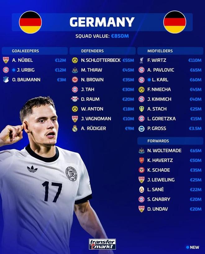 新一期德国队身价榜:维尔茨1.1亿第1,沃尔特马德6500万第2