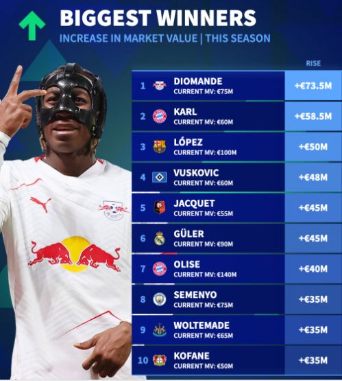 本赛季没有哪位球员的身价涨幅能超过扬·迪奥曼德。科特迪瓦国脚在夏天从莱加内斯转会至RB莱比锡时,身价仅为150万欧元。