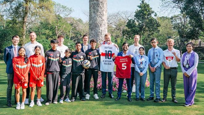 赛场之外,斯图加特的教练团队也切实推动了足球运动在印度青少年群体中的普及。团队到访萨沃塔姆国际学校,为校内约 100 名孩子带来了他们人生中第一堂系统化的足球训练课,印度主流媒体 NDTV、Khelo 等均到场对本次活动进行了专题报道。此次行程的另一高光时刻,是斯图加特团队与苏德瓦青训学院的孩子们一同到访德国驻印度德里大使馆,与德国驻印度大使菲利普・阿克曼展开了轻松友好的交流,现场设置的迷你训练展示环节,也让孩子们在外交场合尽情展现了足球运动的魅力。